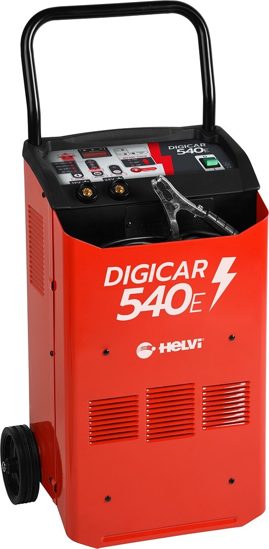 - Helvi DigiCar 540E on ammattikäyttöön soveltuva pyörillä varustettu digitaalinen akkulaturi ja apukäynnistin lyijy-, AGM-, geeli-, Start/Stop- ja Ca/Ca-akuille